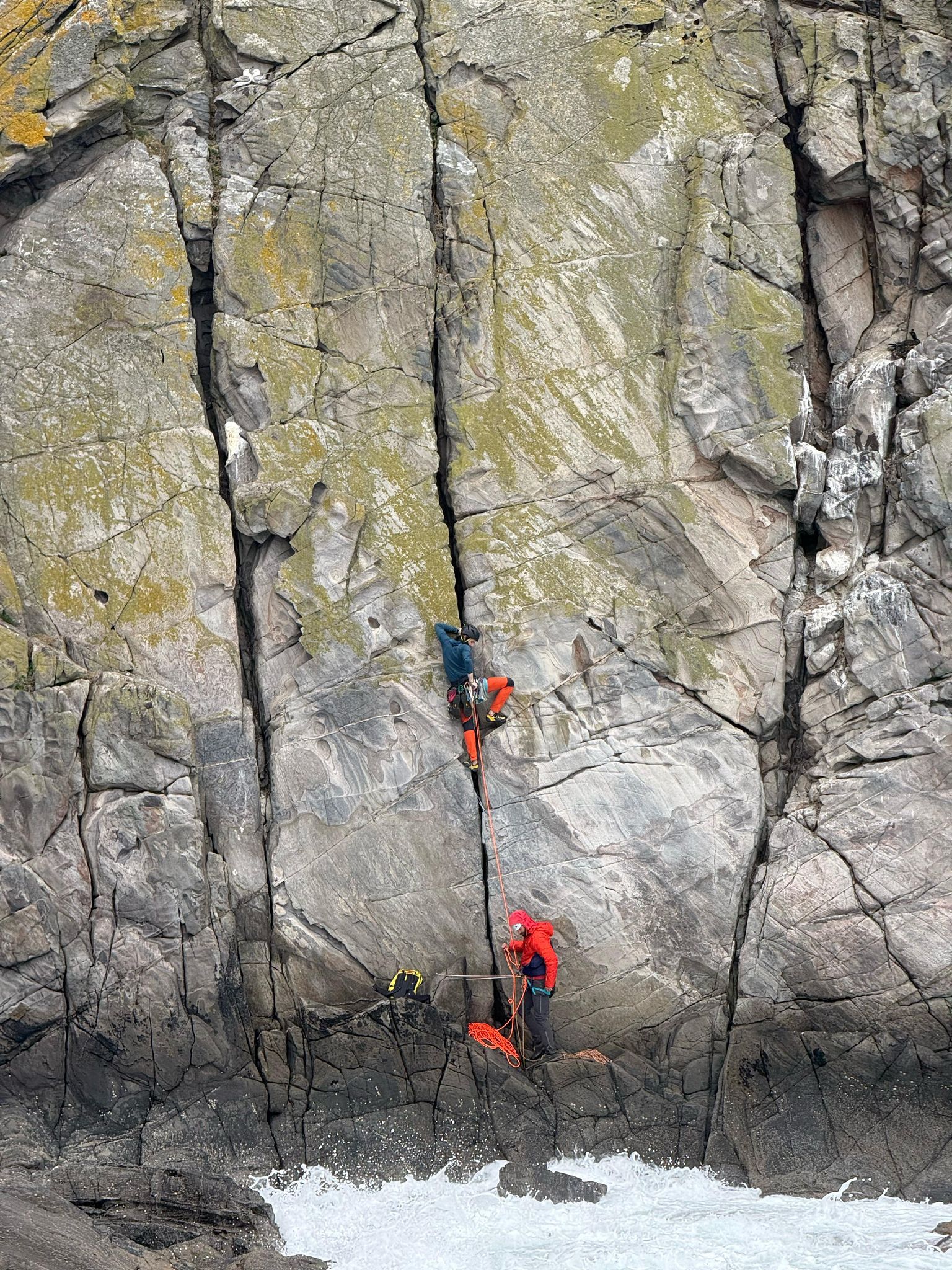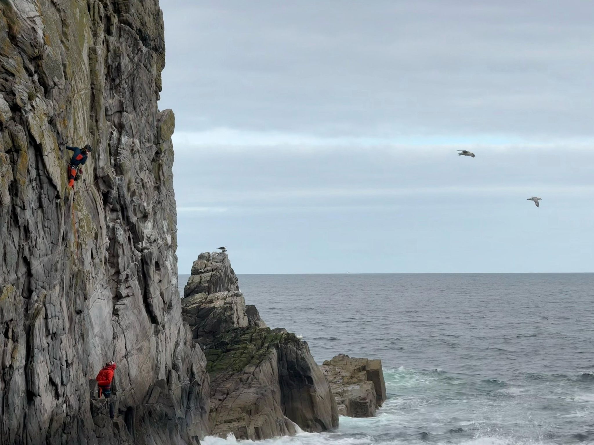 Logie Head cragging with birds as paid actors. 📸: John Cunningham (climbers: Cammy Anderson and Miles Milner)