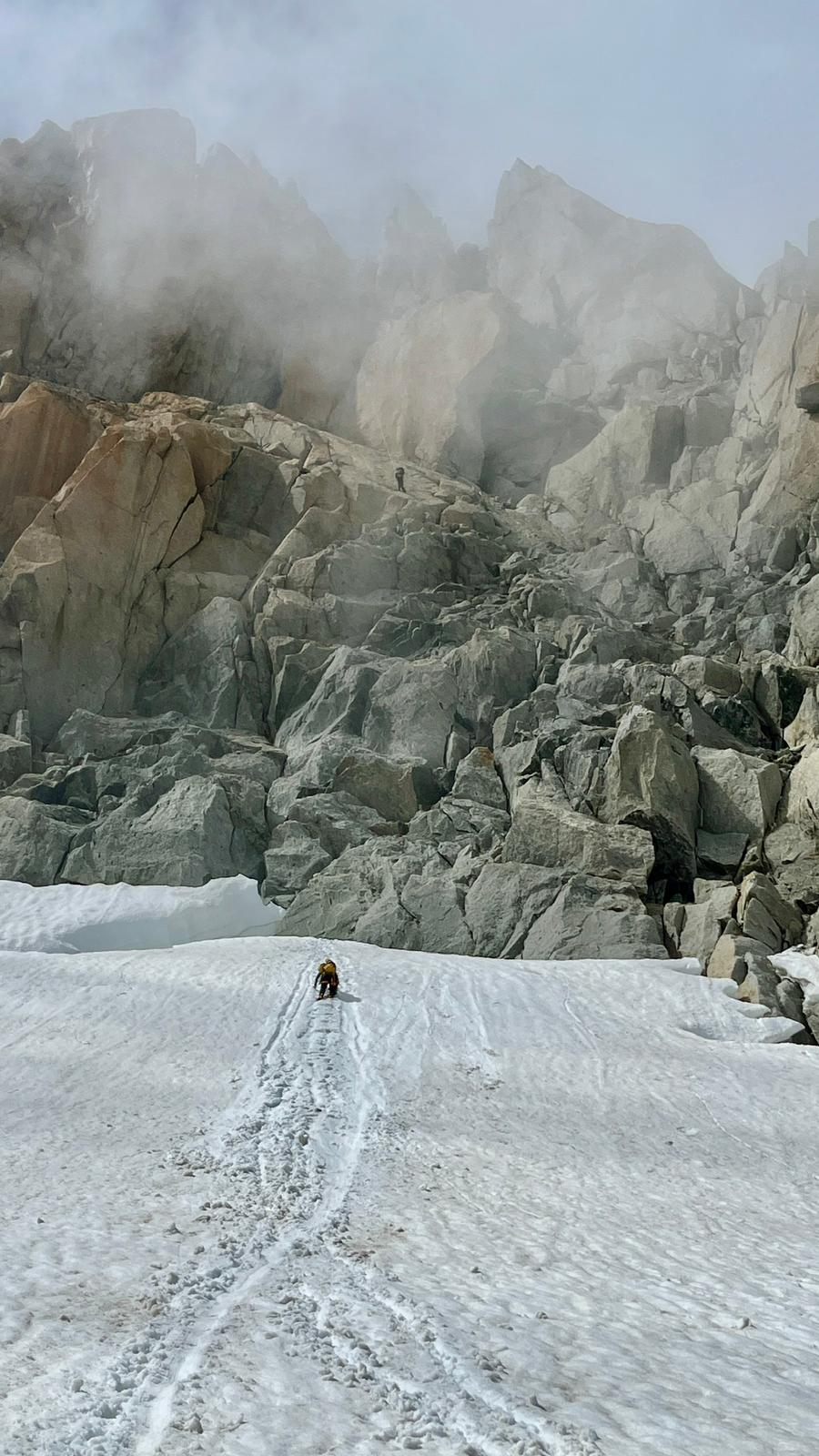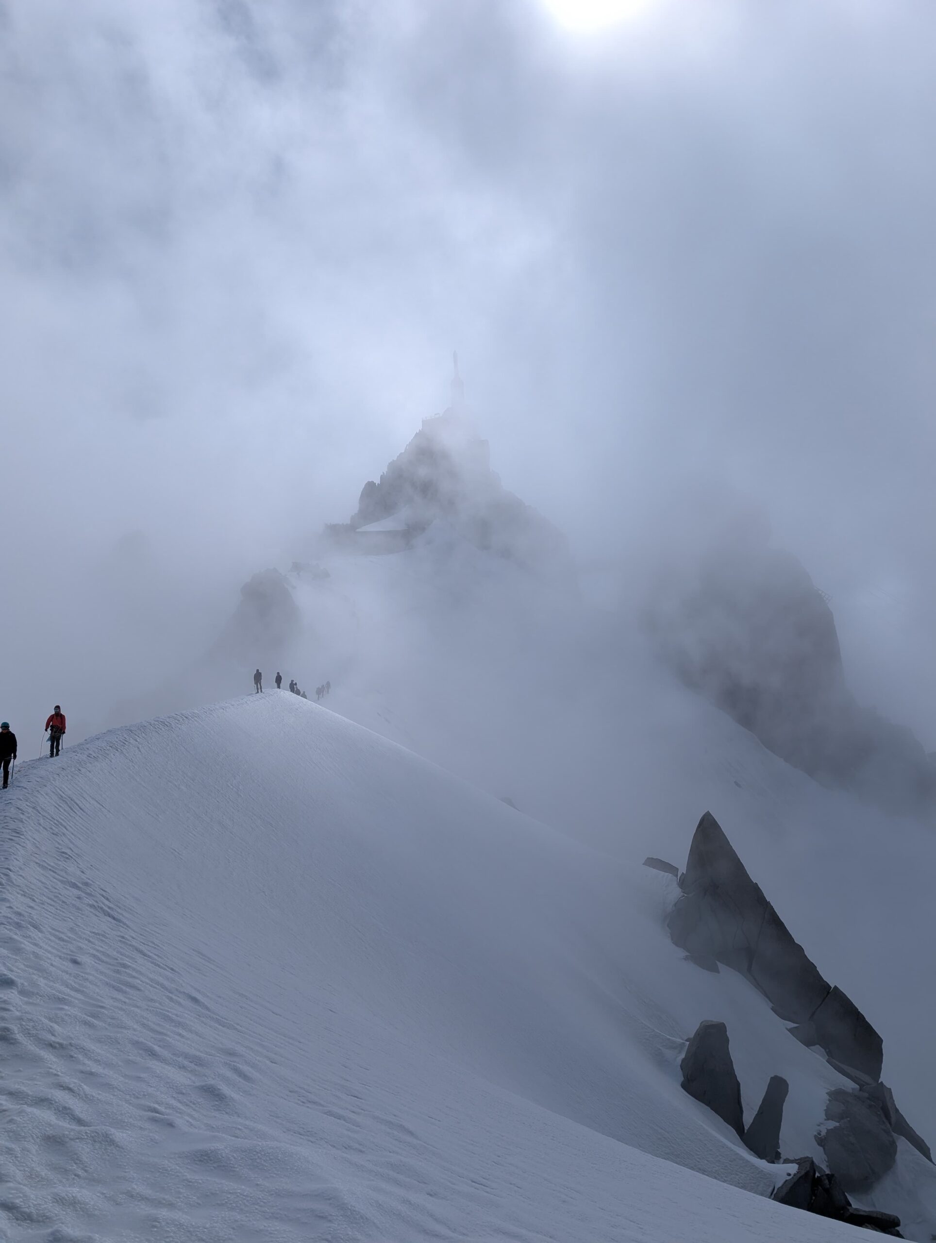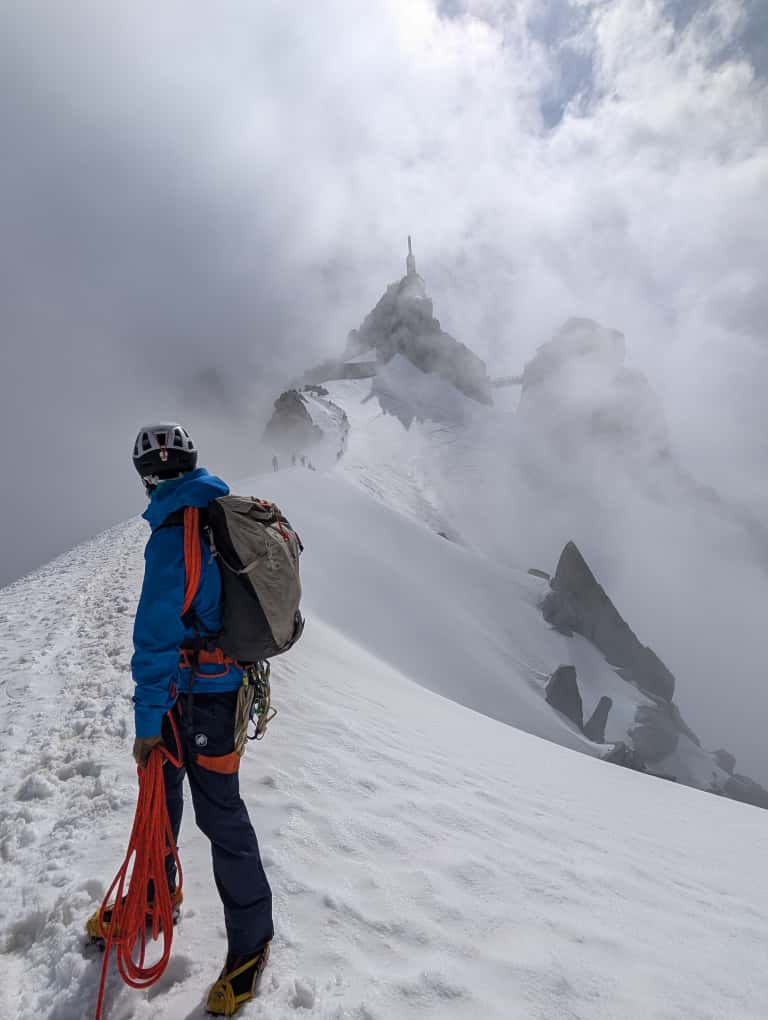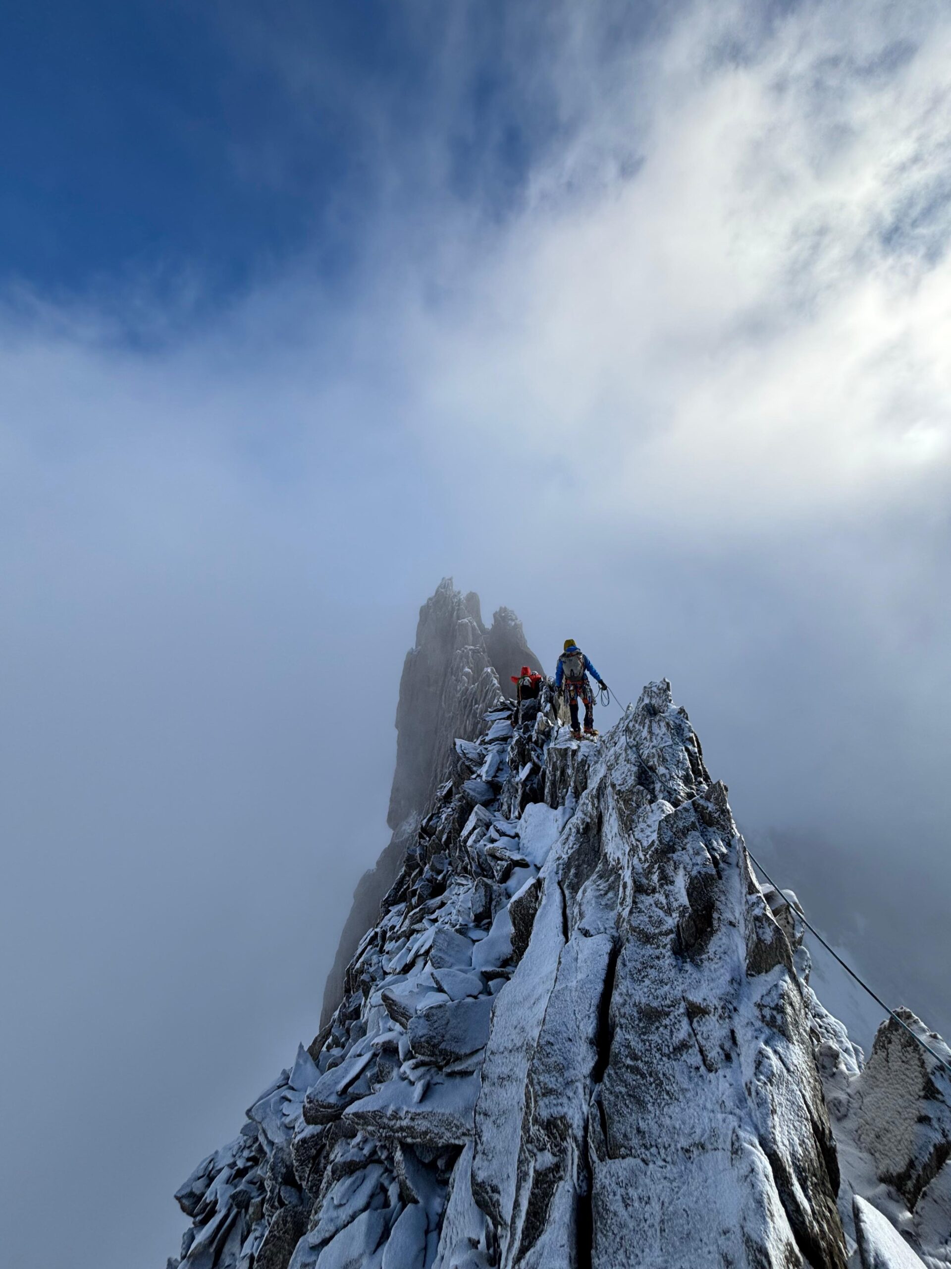 Baptiste and Aurélie stepping into the clouds on the Midi. 📸: Alan Rowe (climbers: Aurélie Najm and Baptiste Poursat)