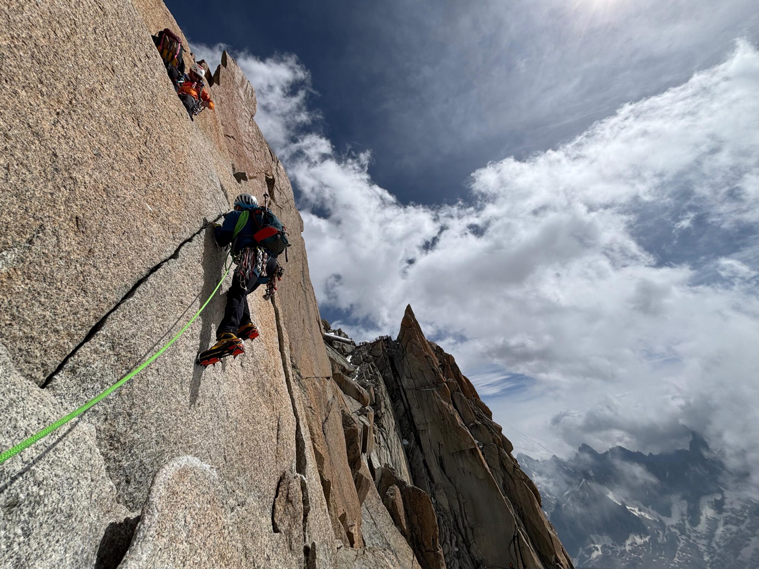 Stefan on the crux of Cosmiques. 📸: Alan Rowe (climber: Stefan Le Roux)