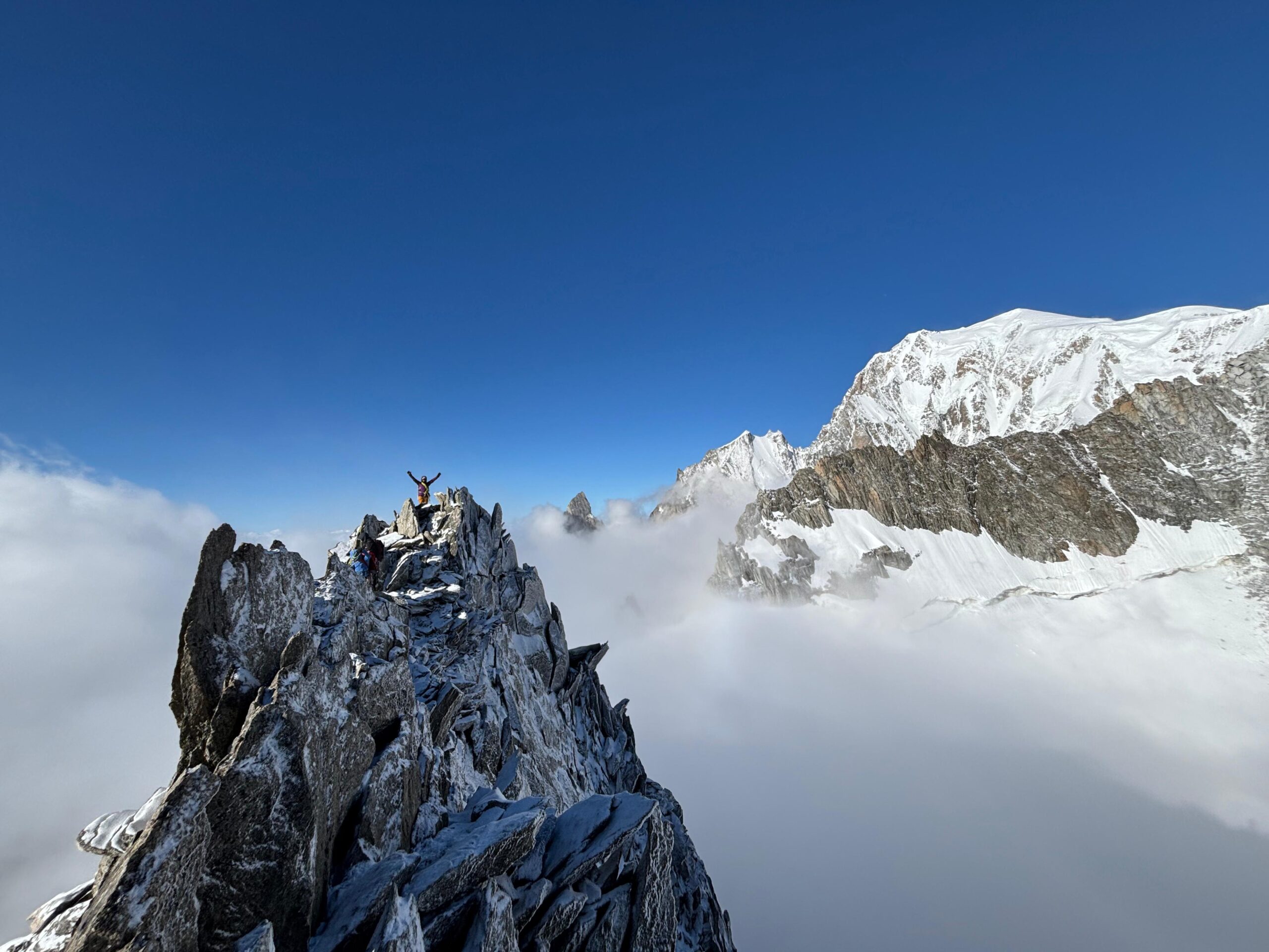 Vicky celebrating the sun coming out on the Aiguille d'Entréves. 📸: Alan Rowe (climber: Vicky Herbert)